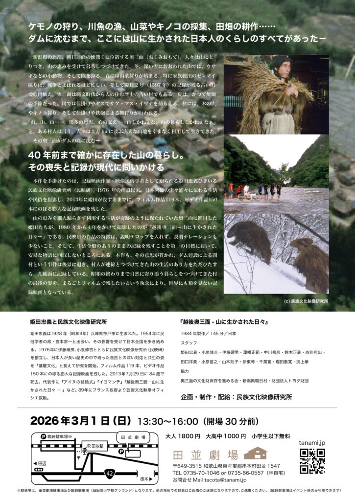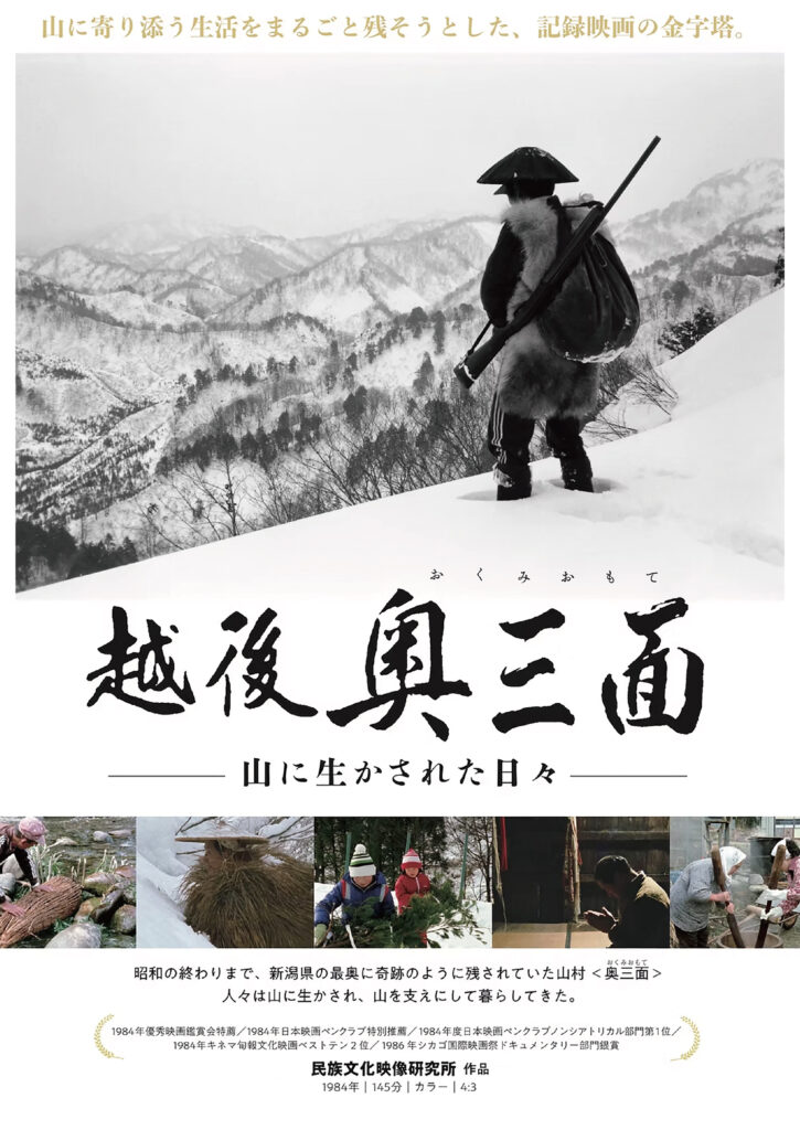 山の恵みを細大漏らさず利用する生活が奇跡のように保たれていた奥三面に瞠目した姫田たちが、1980年から4年をかけて撮影したのが『越後奥三面ー山に生かされた日々ー』である。民映研の作品の特徴は、説明テロップを入れず、説明ナレーションも少ないこと。そして、生活全般のありのままの記録を残すことを第一の目標において、安易な物語に回収しないところにある。本作も、その意思が貫かれ、ダム建設による閉村という事件は後景に退き、村人が連綿とつづけてきた山の生活のあり方をただひたすら、几帳面に記録している。昭和の終わりまで自然に寄り添う暮らしをつづけてきた村の最後の姿を、まるごとフィルムで残したいという執念により、世界にも類を見ない記録映画となっている。
